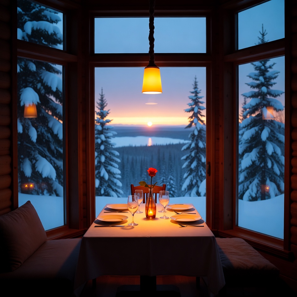 A table is set for dinner in a cozy cabin. Snow covers the ground outside. The sun sets behind tall trees, creating a warm glow.