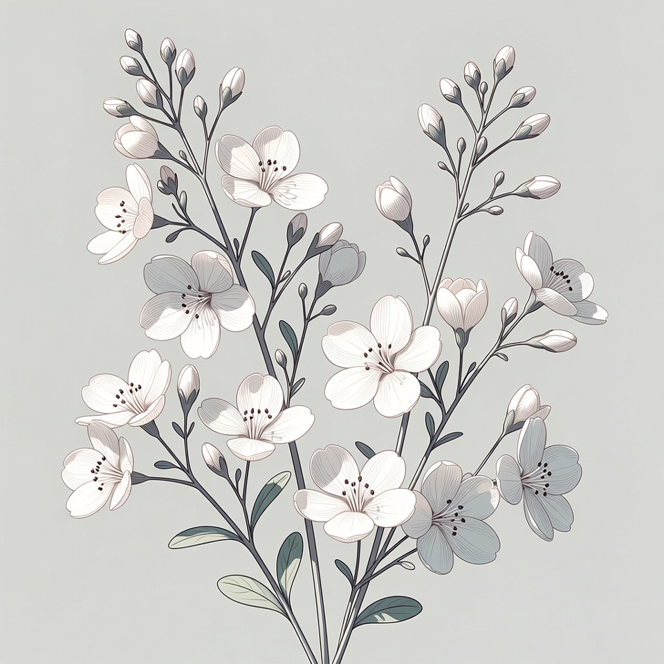 arrangement, art, blossom, botanical, creativity, decoration, design, elegant, floral art, flowers, grey background, interior, minimalism, nature, plant, simple design, sketch, spring, vector, white petals