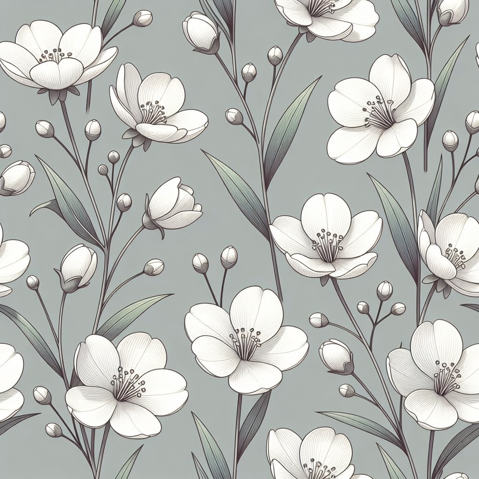 White flowers with green leaves cover a gray background. The design features different flower stages and adds a natural look to the space.