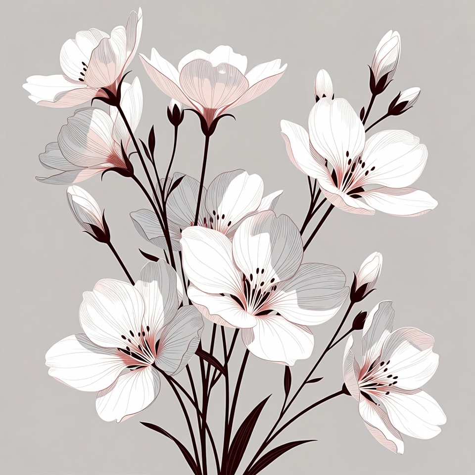 beauty, bloom, botanical, branches, dark stems, decoration, delicate, design, feminine, flora, floral, flowers, gray background, illustration, minimalism, nature, petal, plant, simplicity, white petals