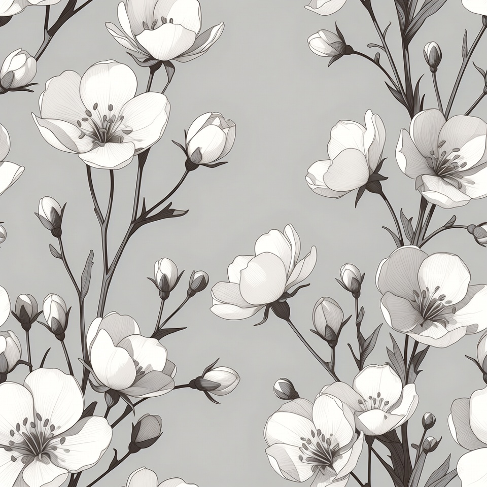 White flowers with dark branches cover a gray surface. The design features various blossoms and buds. It creates a floral theme.