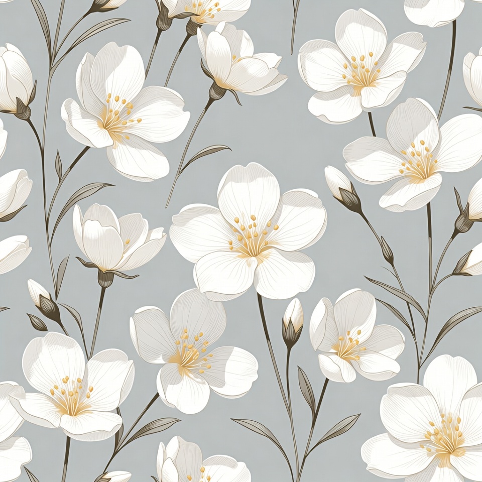 White flowers bloom against a gray background, showcasing their delicate design and fine details. This pattern creates a soft visual effect.