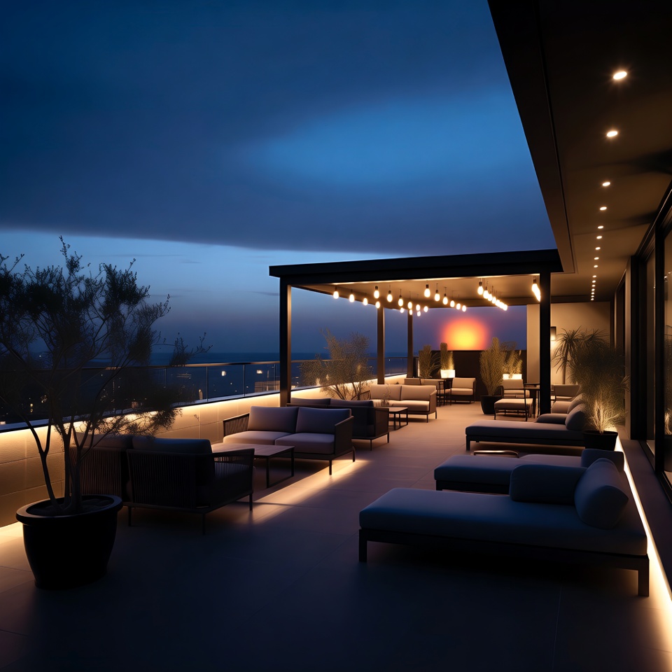 A rooftop area shows seating under lights with a sunset in the background. The scene has a relaxed atmosphere with lounge chairs.