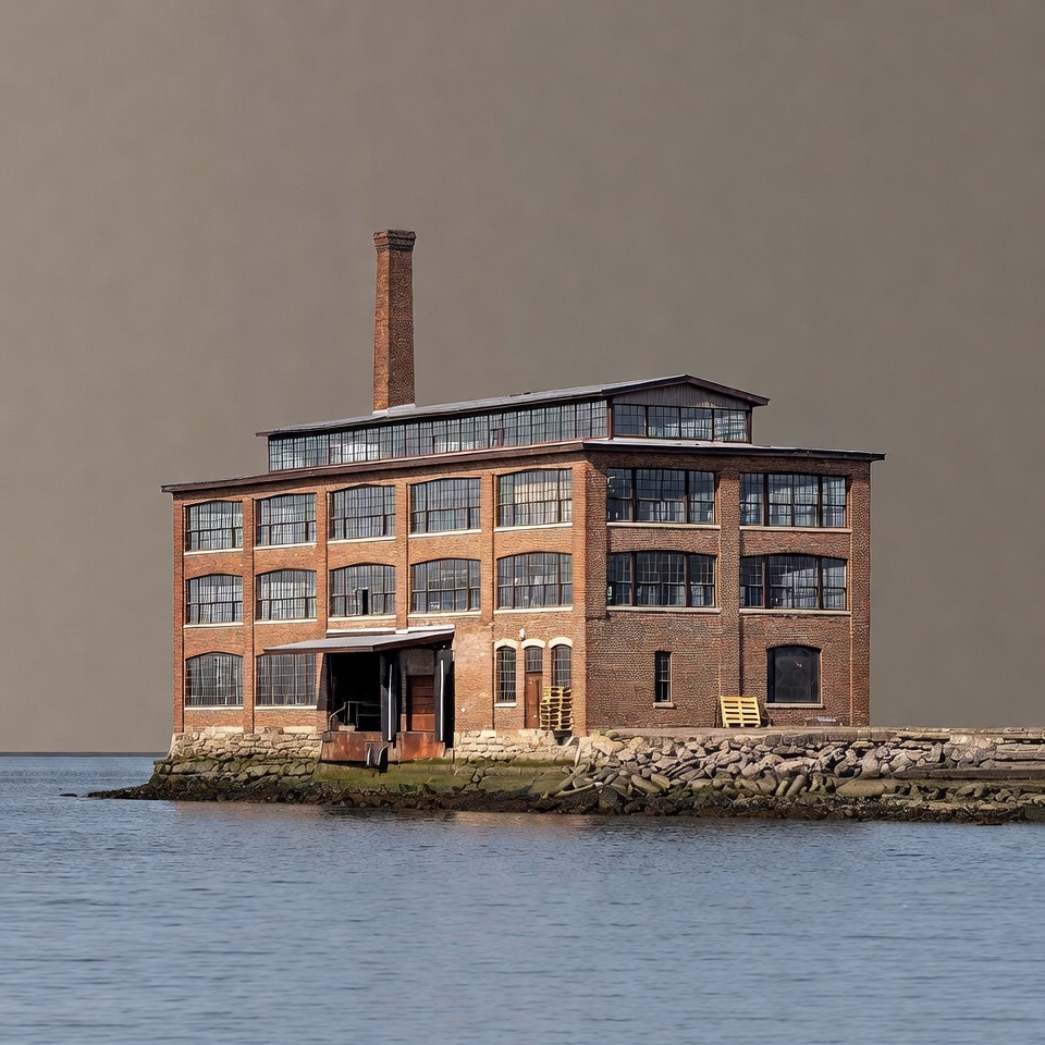An old brick structure stands near the water's edge, showcasing large windows and a tall chimney. The scene captures a quiet industrial area.