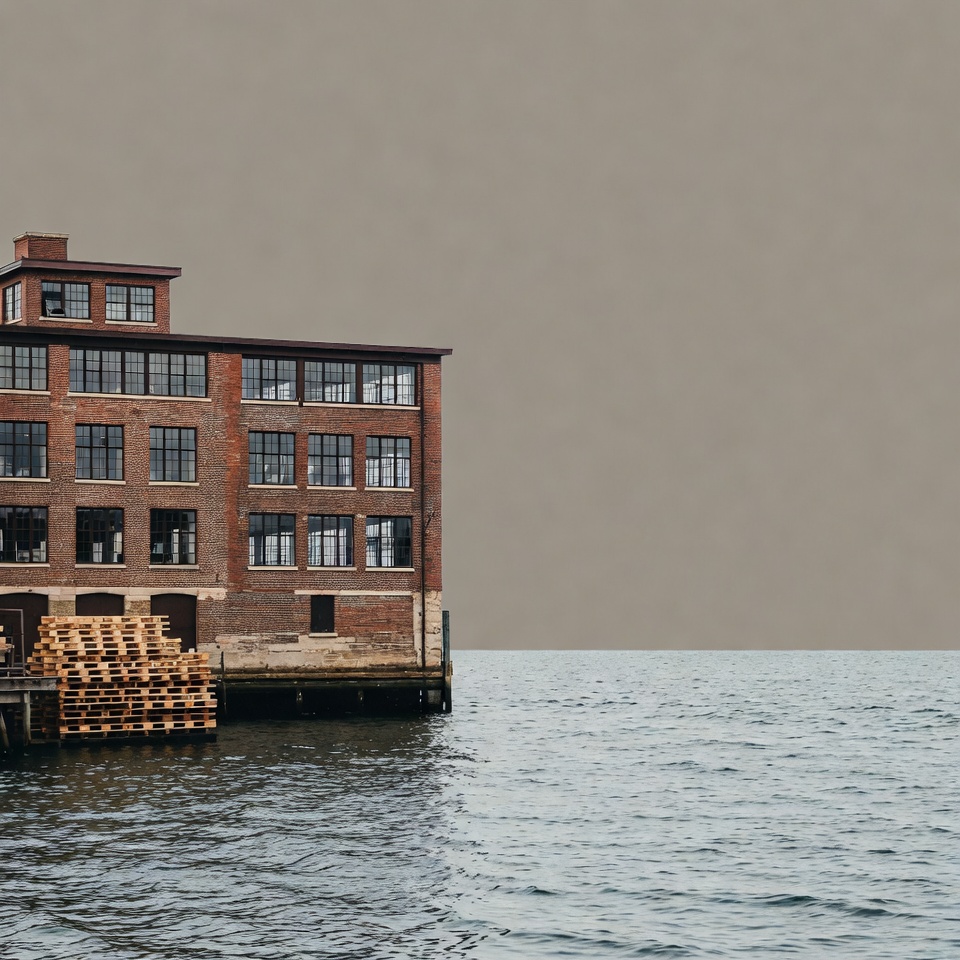 A large brick building sits next to calm water with wooden pallets stacked at its side during sunset. The sky appears hazy around the structure.