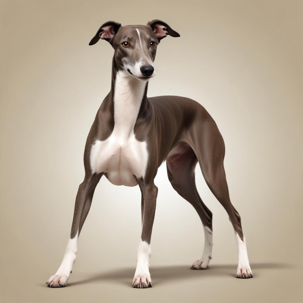 animal, attention, breed, breed characteristics, canine, confident, dog, fur, greyhound, indoor, looking, paws, pet, playfulness, portrait, posture, simple background, smooth coat, standing, studio