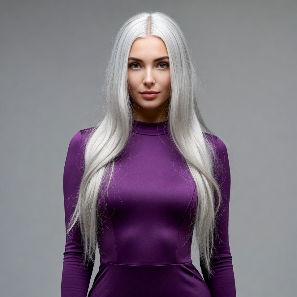 Model stands in a studio wearing a purple outfit. Long silver hair falls straight down. The background is plain and light.