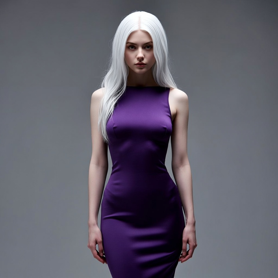 A young model stands confidently indoors, wearing a long purple dress. Her long white hair adds to her striking look and presence.