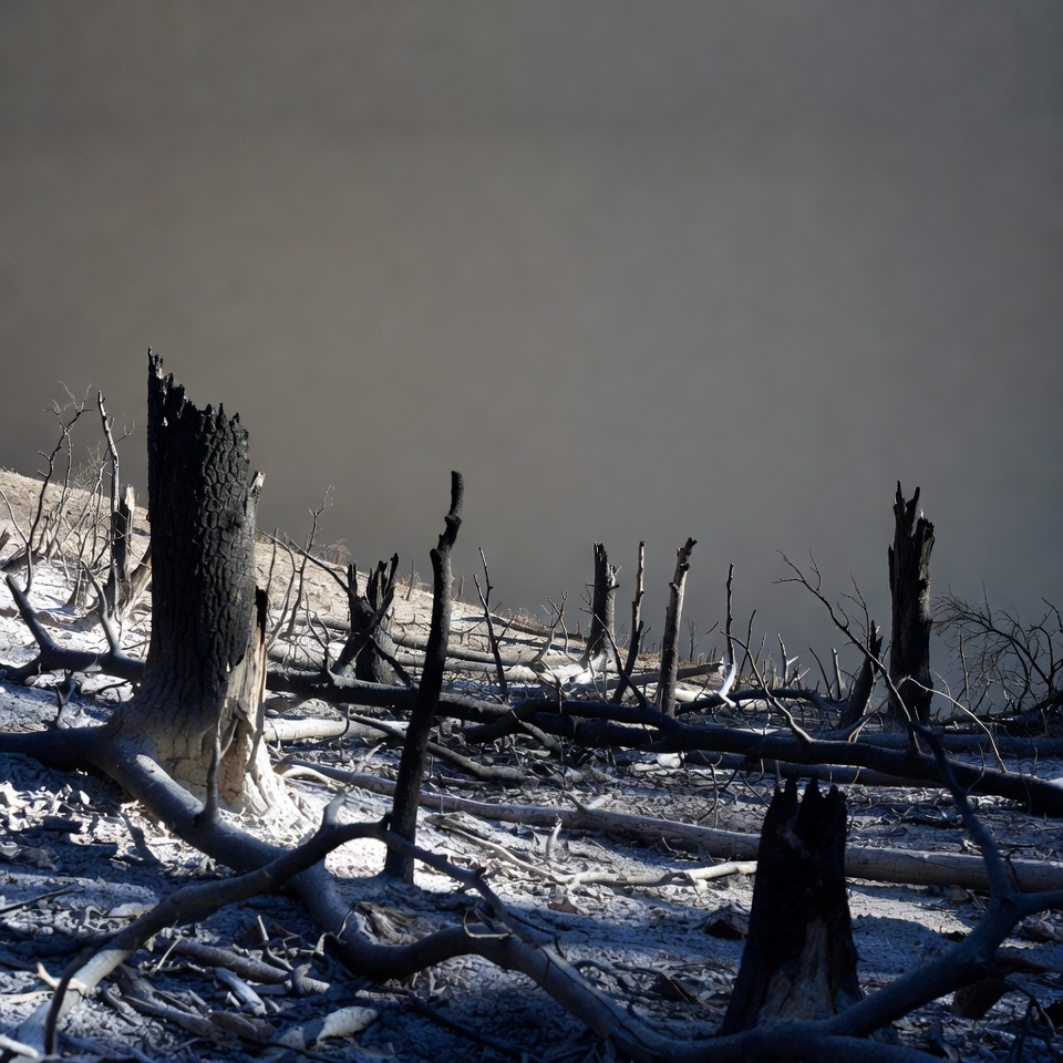 Trees stand lifeless in a burned forest area. Ash covers the ground and gray skies loom overhead, showing the aftermath of a fire.