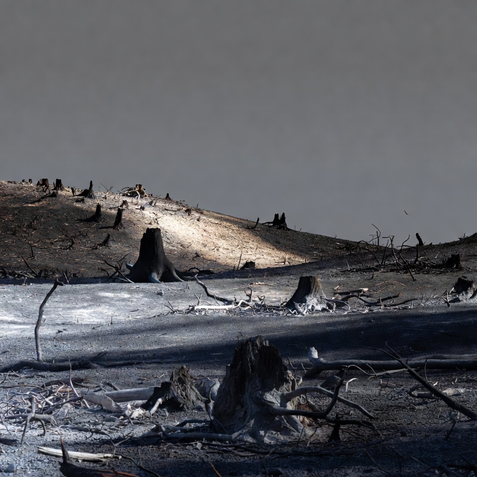 Land shows signs of destruction with tree stumps standing. Ash covers the ground. The area is dark with patches of light visible.