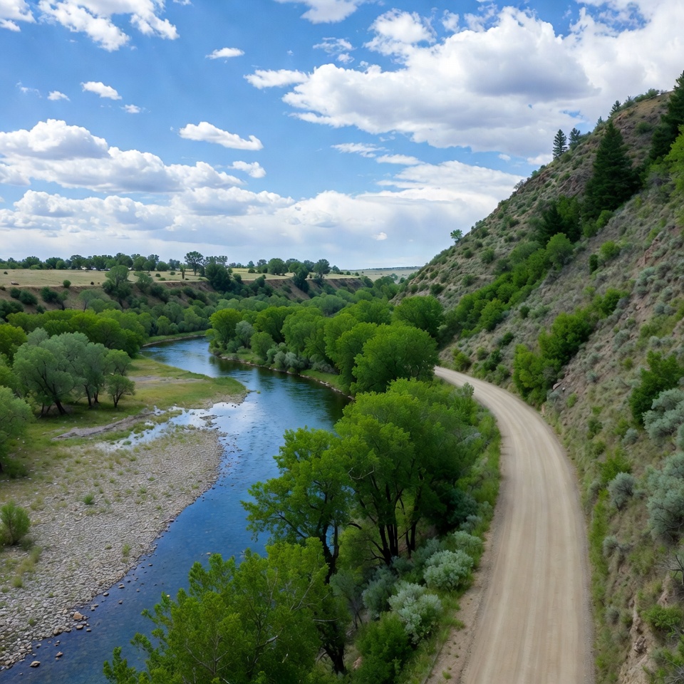 A river flows through a green valley under a blue sky with clouds. A dirt road runs beside the river in a rural area.