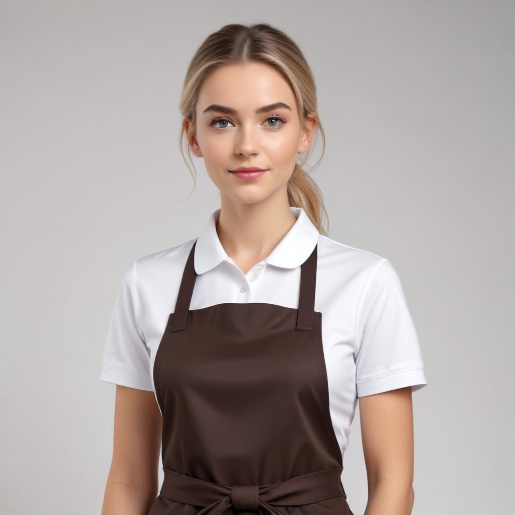 apron, background, brown, casual, employee, engagement, expression, face, fashion, gray, outerwear, person, portrait, professional, service, shirt, simple, standing, uniform, worker