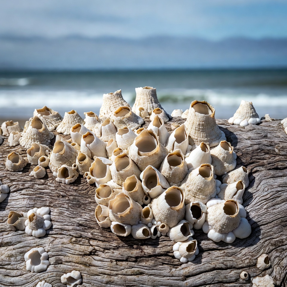 Clusters of white shells are gathered on a piece of driftwood by the ocean shore, with waves and a blue sky in the background.