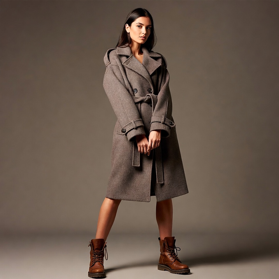 A model stands confidently in a gray coat and brown boots. The backdrop is neutral, focusing attention on the clothing and pose.