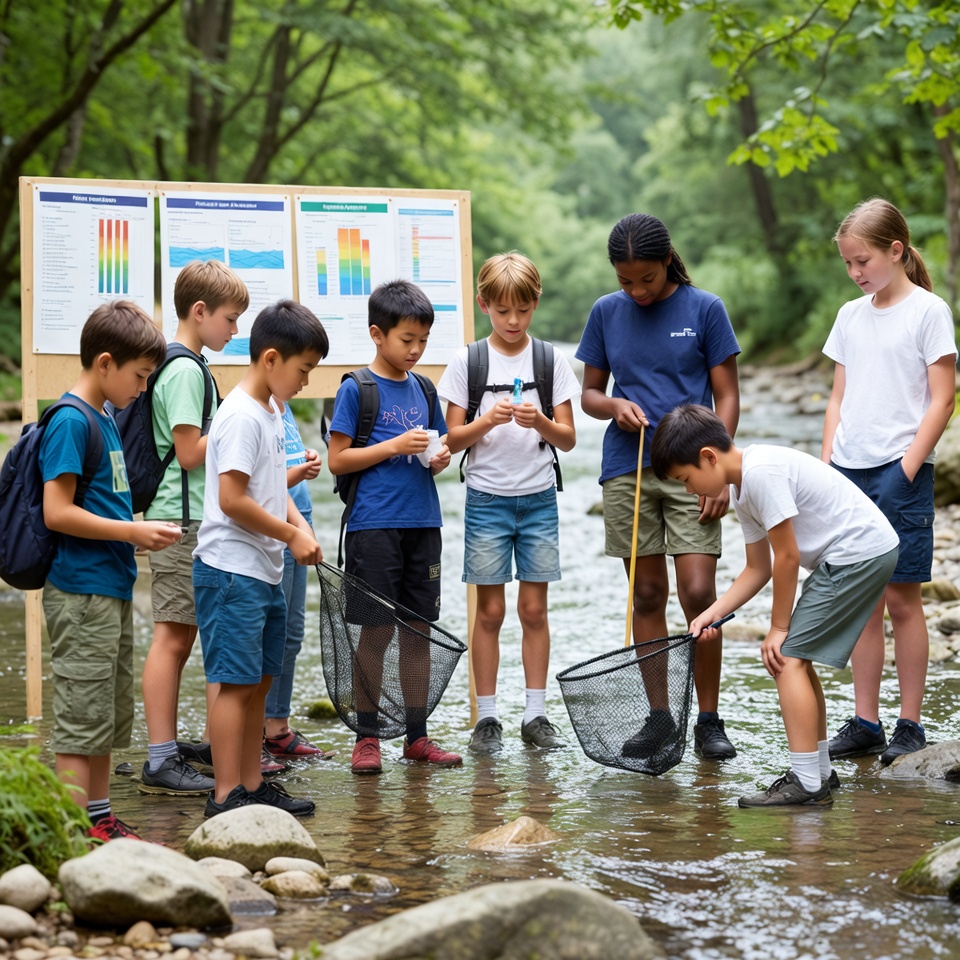 Group of students gather by a stream in nature to learn about aquatic life. They use nets to catch and observe small creatures.