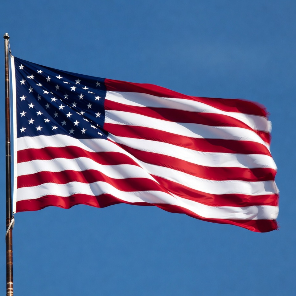 The flag of the United States flies high against a clear blue sky, symbolizing national pride and unity. It flutters gently in the breeze.