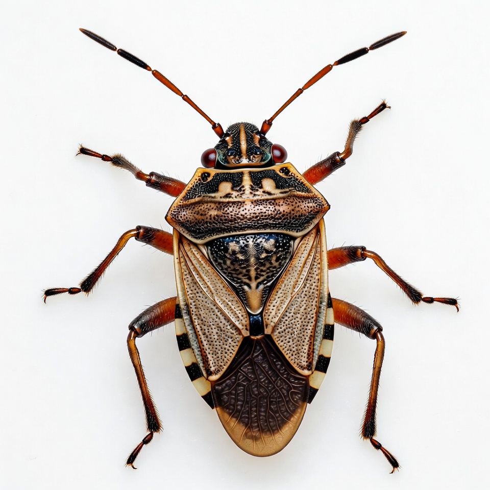 A brown insect stands on a plain white background. The insect has distinct patterns and is clearly visible from above.