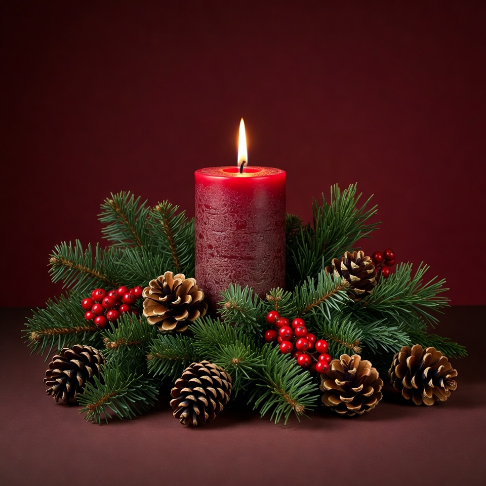 A red candle burns brightly surrounded by pine branches and pine cones. Red berries add color. This scene captures a festive mood.