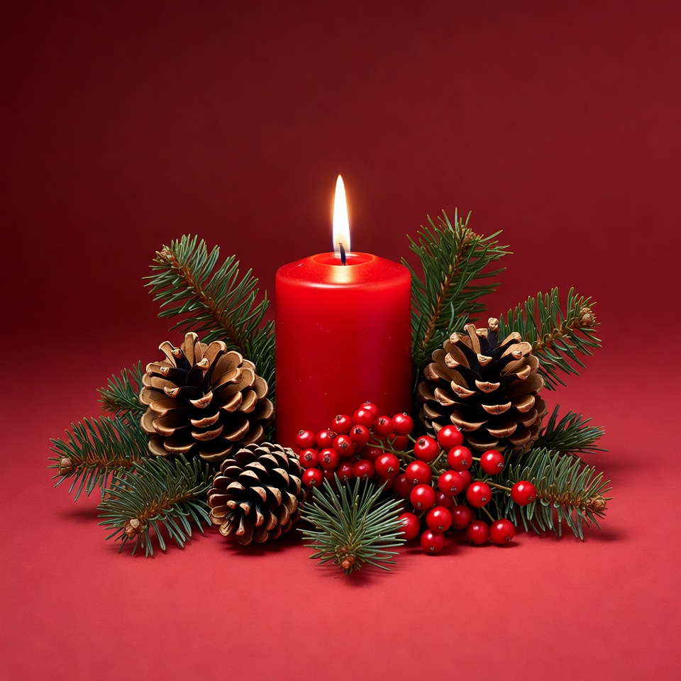 A red candle burns in the center of a display with pinecones and red berries on a red background during the holiday season.