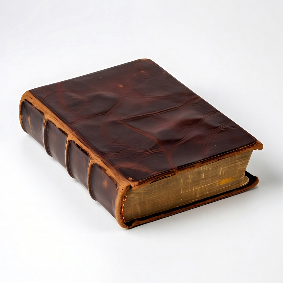 A leather bound book sits on a white background with its spine showing signs of wear. The book has thick pages and a simple design.