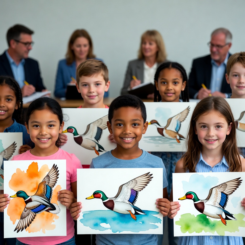 adults, art, children, classroom, colorful, creativity, display, drawing, ducks, education, expression, learning, observation, paintings, presentations, school, smiles, teamwork, watercolor, young artists