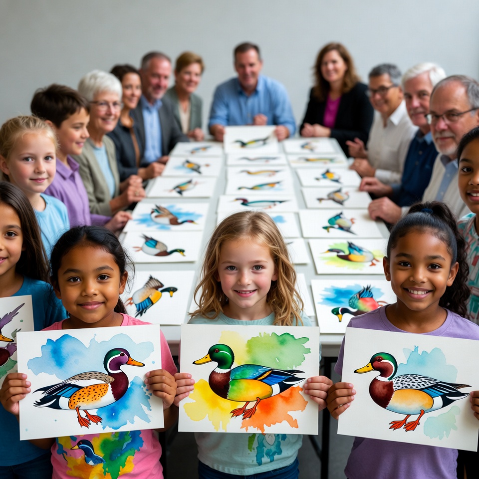 Children and adults gather around a table showcasing colorful duck paintings. They smile while holding their art in a collaborative setting.
