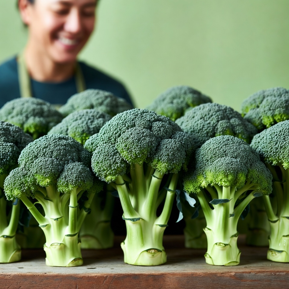 A person arranges fresh broccoli on a wooden table. Green background shows a lively market with various vegetables around.
