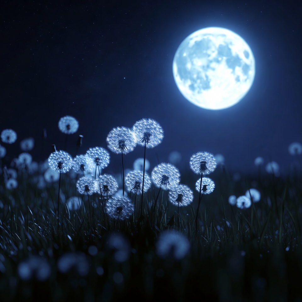 Dandelions stand in a field at night. A bright full moon lights up the scene, creating a magical atmosphere with soft light.