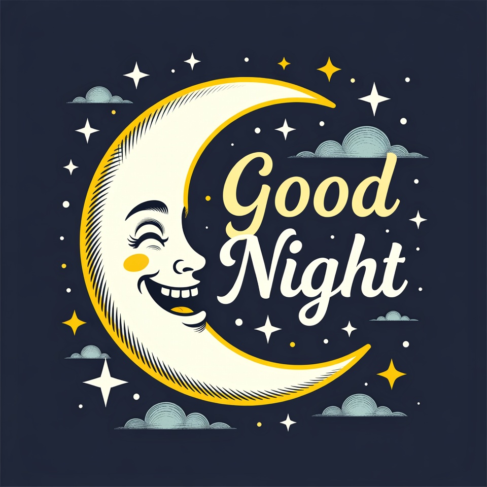 art, cheerful, clouds, decoration, design, dream, evening, graphic, greeting, illustration, joyful, moon, night, night sky, poster, smile, stars, typography, vintage, whimsical