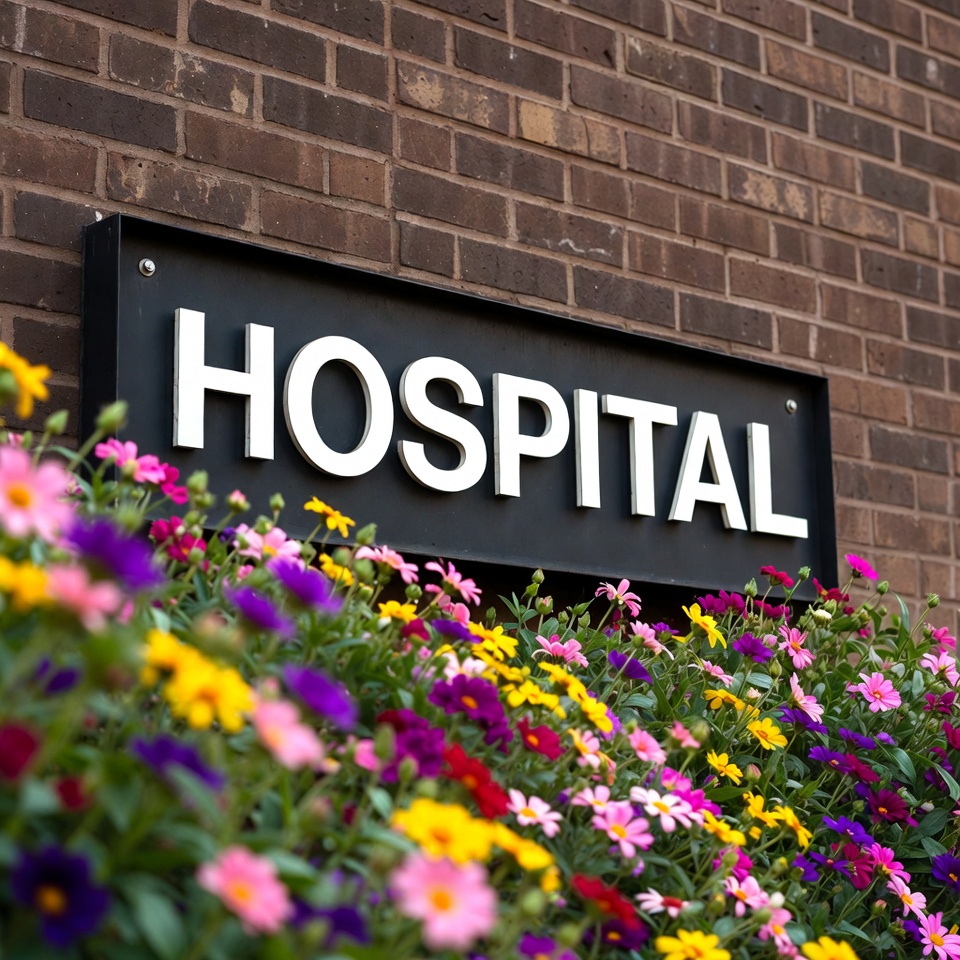 Hospital sign with flowers in front