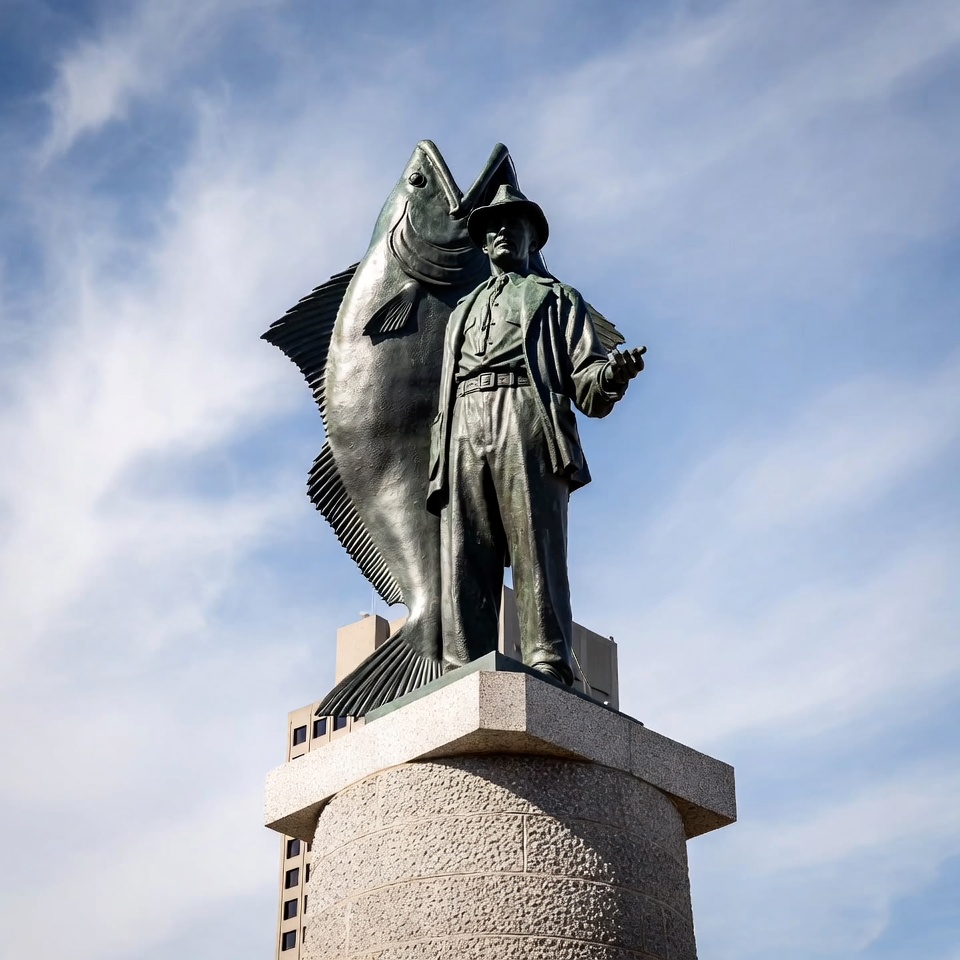 Fisherman statue near waterfront area