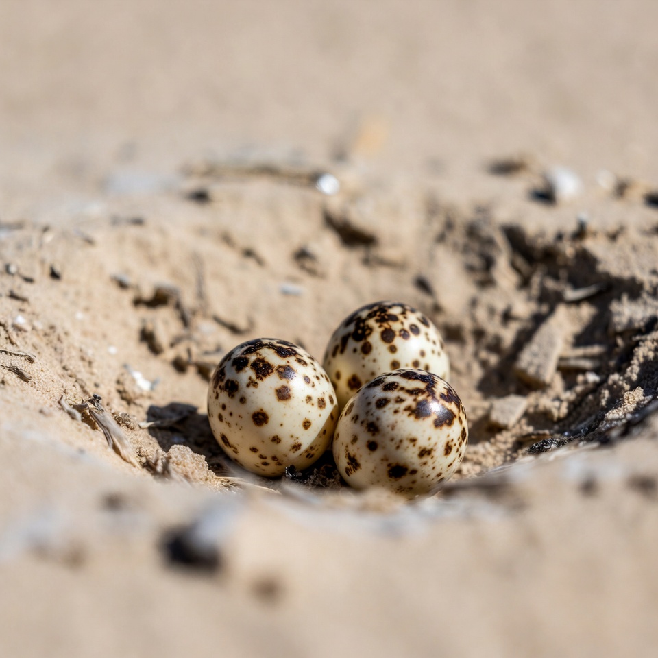 Three speckled eggs rest in a small nest made of sand, embracing sunlight at a beach location during the day.