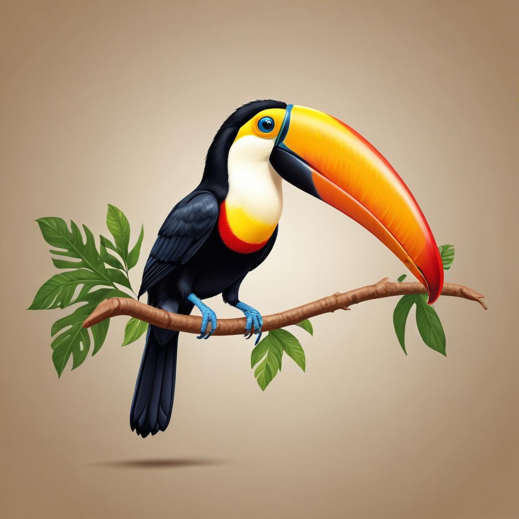 A toucan with a large bill is perched on a branch surrounded by green leaves. The background shows a plain color without distractions.
