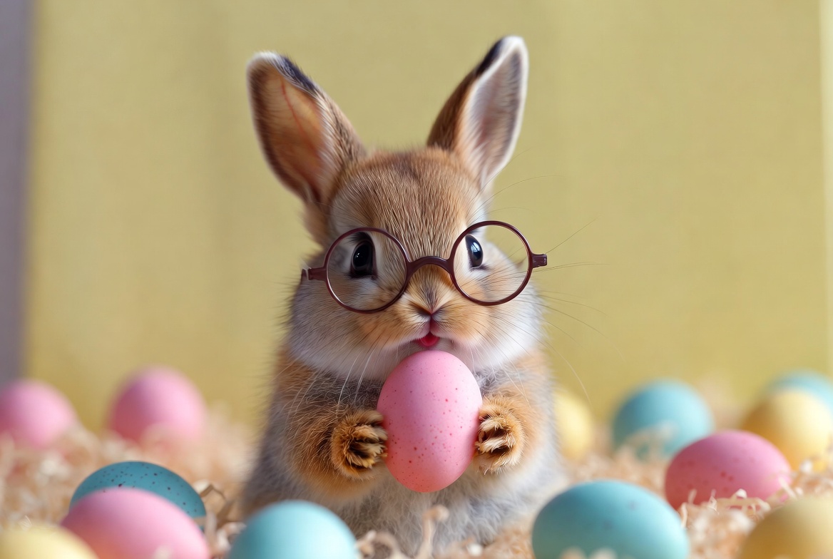 A small rabbit wearing glasses is holding a pink egg among blue and pink eggs in a nest. The background is bright and colorful, enhancing the scene.