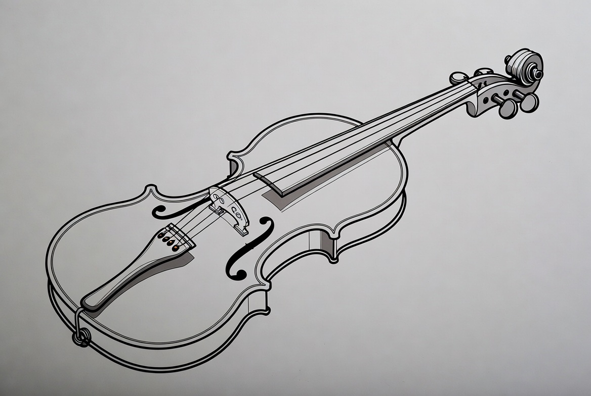 A detailed sketch of a violin sits on a plain white background. The design focuses on the instrument's body and strings.
