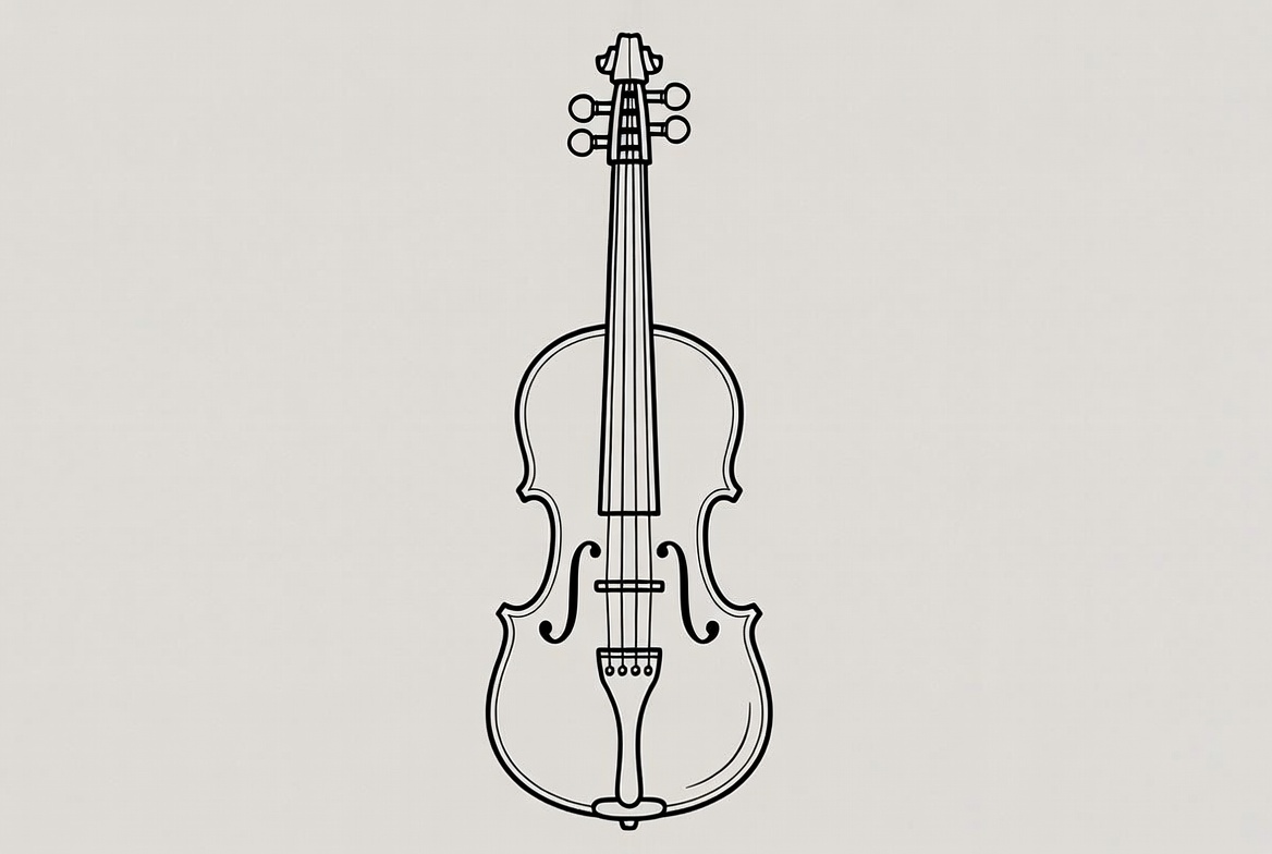A violin is drawn in black outline on a light background. The instrument shows detailed parts without color, focusing on its shape.