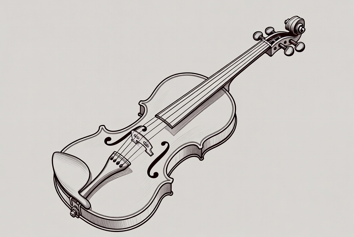 A close view of a violin shows its body, strings, and tuning pegs. The design highlights the craftsmanship and details of the instrument.