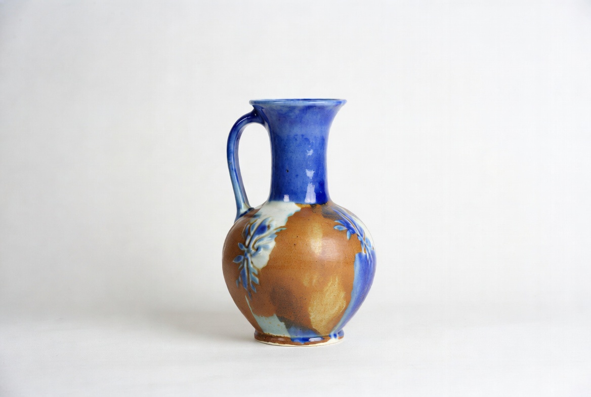A ceramic jug stands on a plain background. The jug is decorated with blue and brown patterns, showcasing craftsmanship and design.