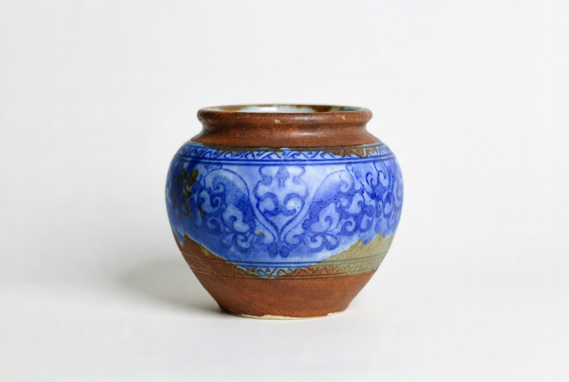 A small pottery jar sits on a white surface. It features blue designs on the body and a brown rim. The shape is round and smooth.