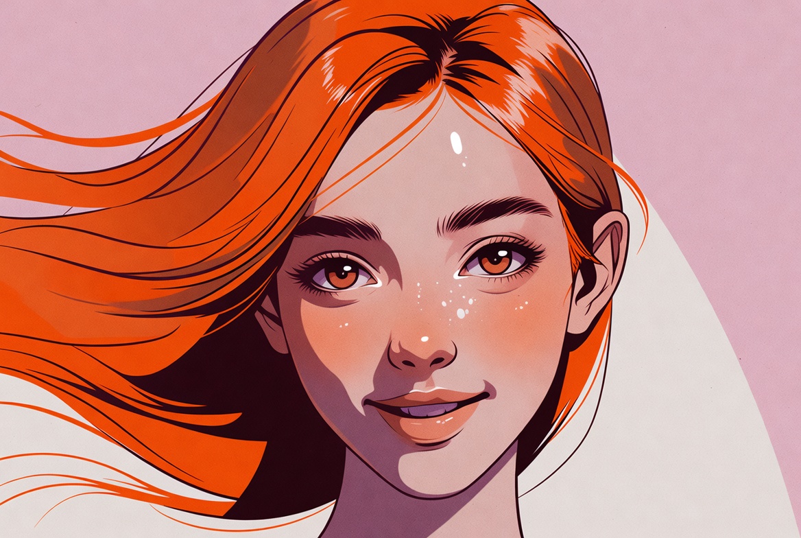 art, background, beauty, bright colors, character, colorful, design, expressive, eyes, face, female, hair flowing, illustration, portrait, red hair, skin, smiling, style, woman, youth