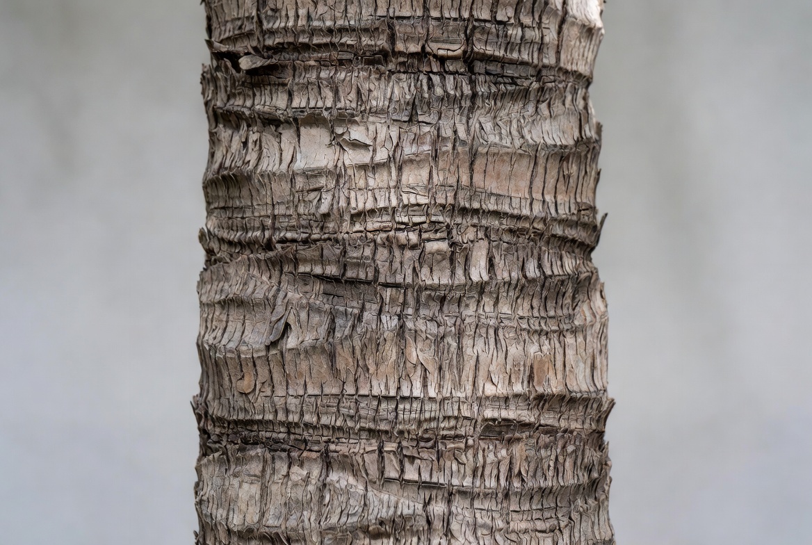 A tree trunk stands tall, showcasing its rough and detailed bark surface. The setting highlights the unique textures found in nature.
