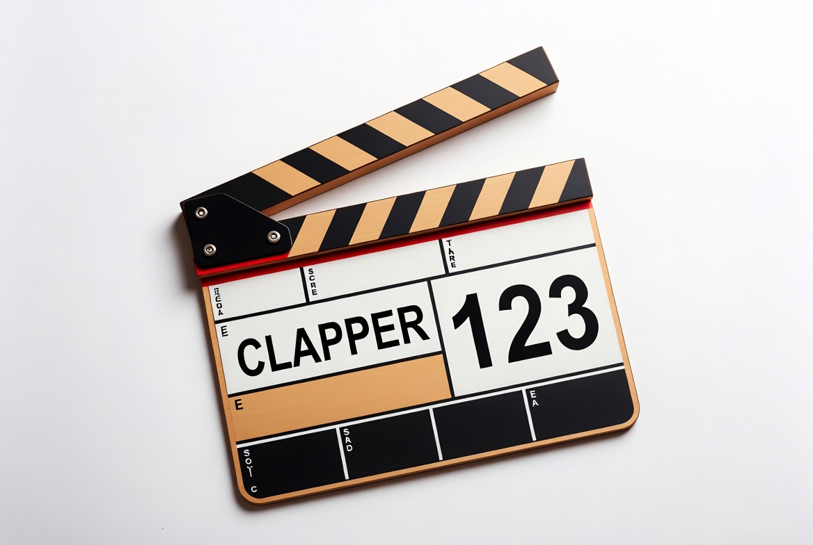 Clapper board rests on a plain white surface with numbers and markings visible. It is ready for use in a film scene.