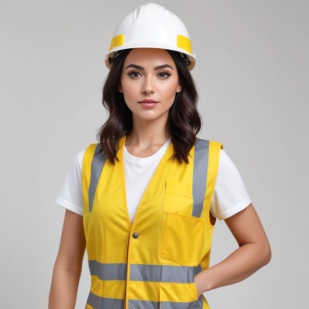 attire, background, casual, confident, construction, helmet, industry, lifestyle, outfit, person, portrait, professional, safety, safety gear, site, standing, vest, woman, worker, yellow