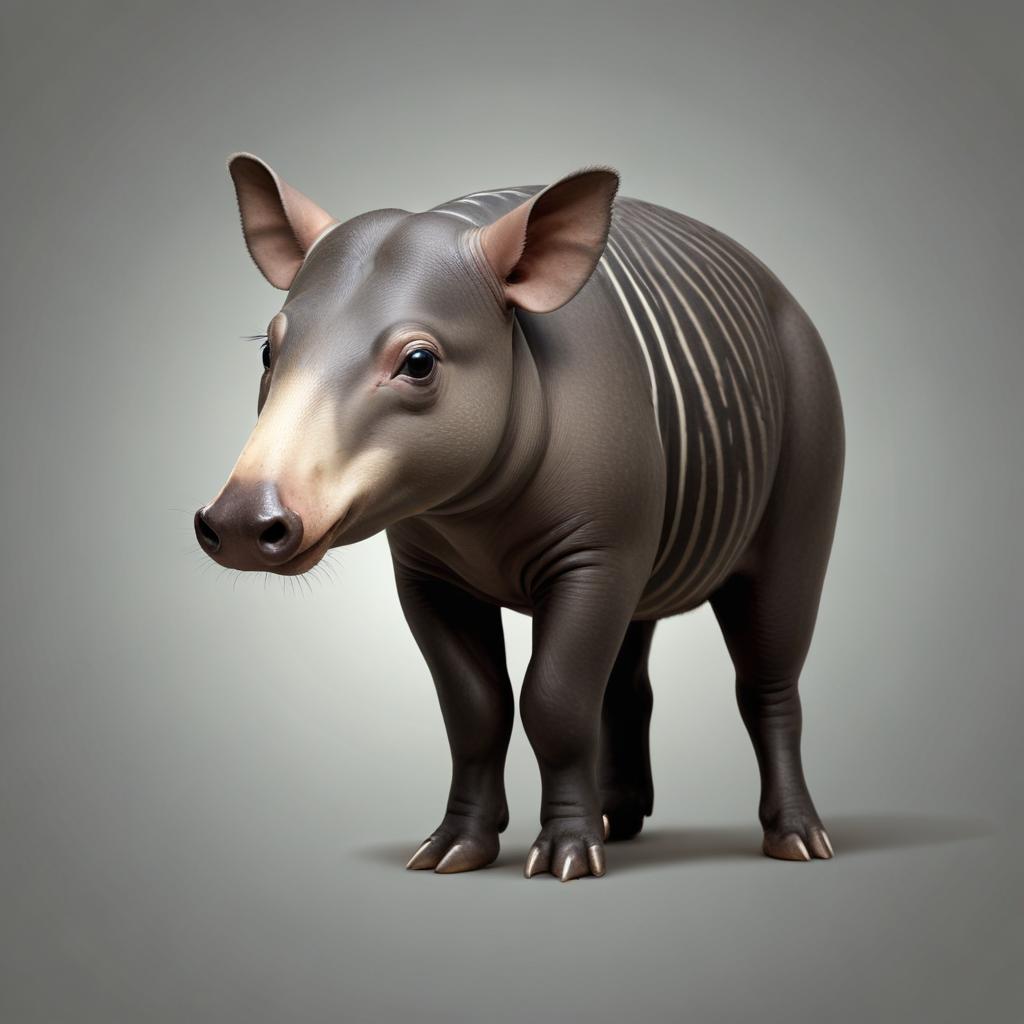 A tapir stands on all fours in a plain background. The animal has noticeable stripes and a stout body, typical of its species.