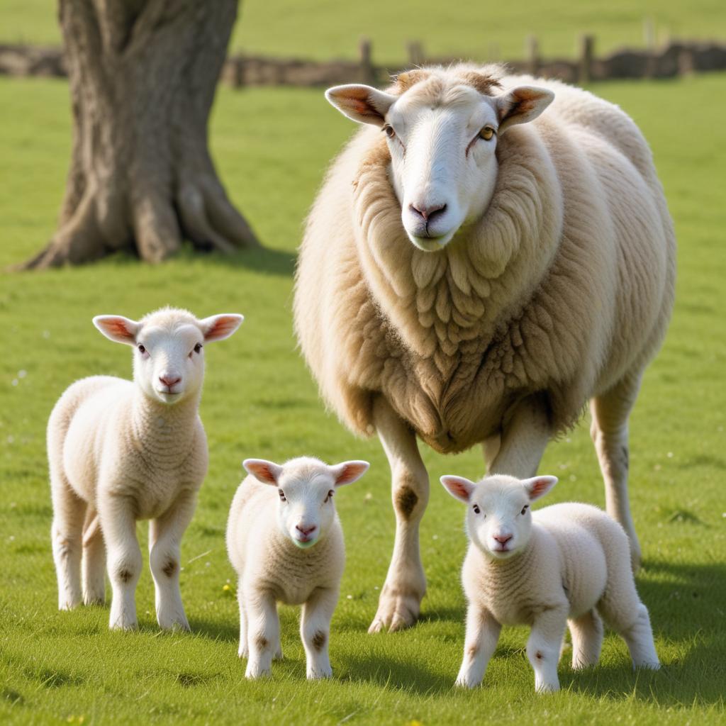 A sheep stands with three lambs in a green field during daylight. They are grazing near a tree on a sunny day.