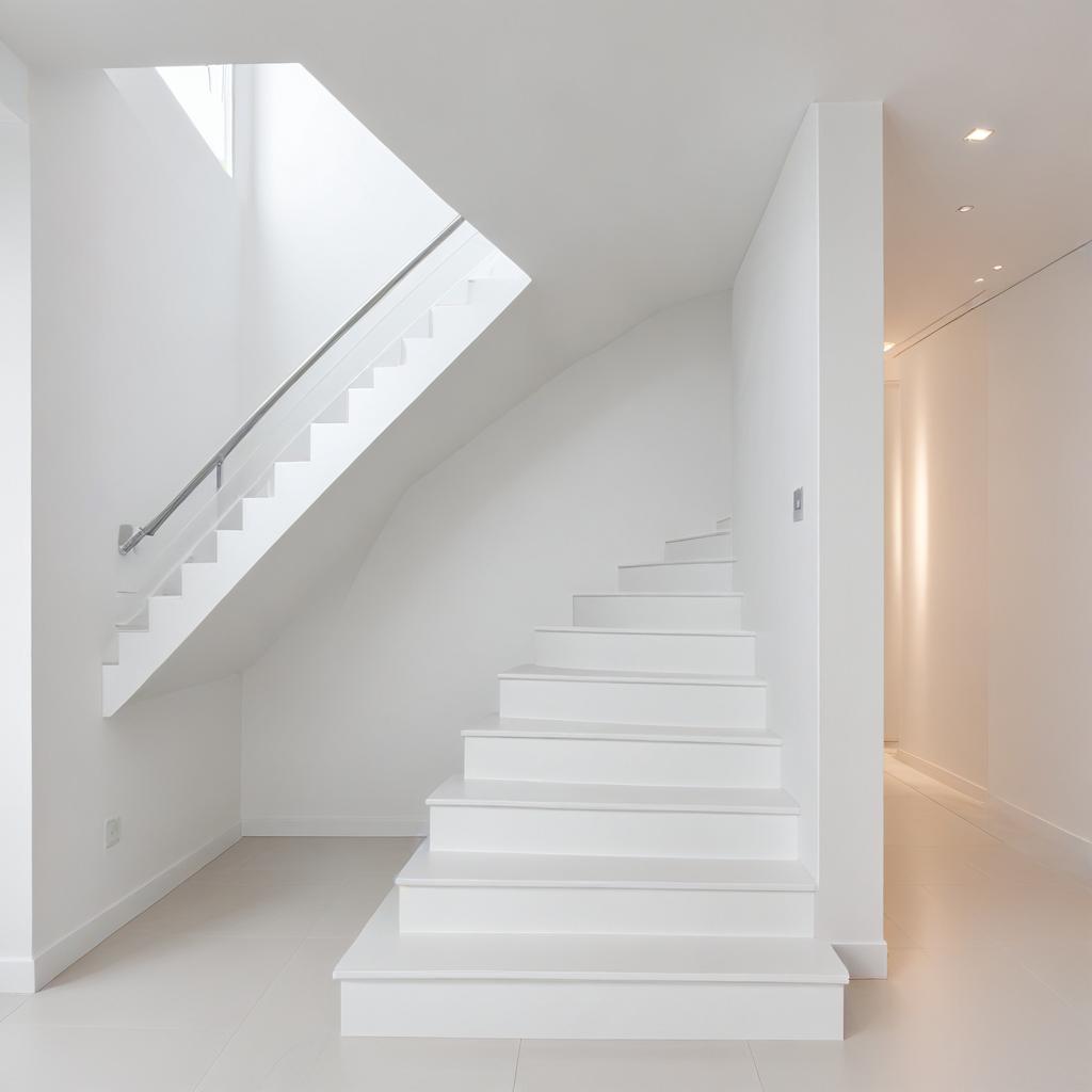 A stairway leads to an upper floor in a white interior with simple lines and bright lighting, creating a contemporary look in the area.