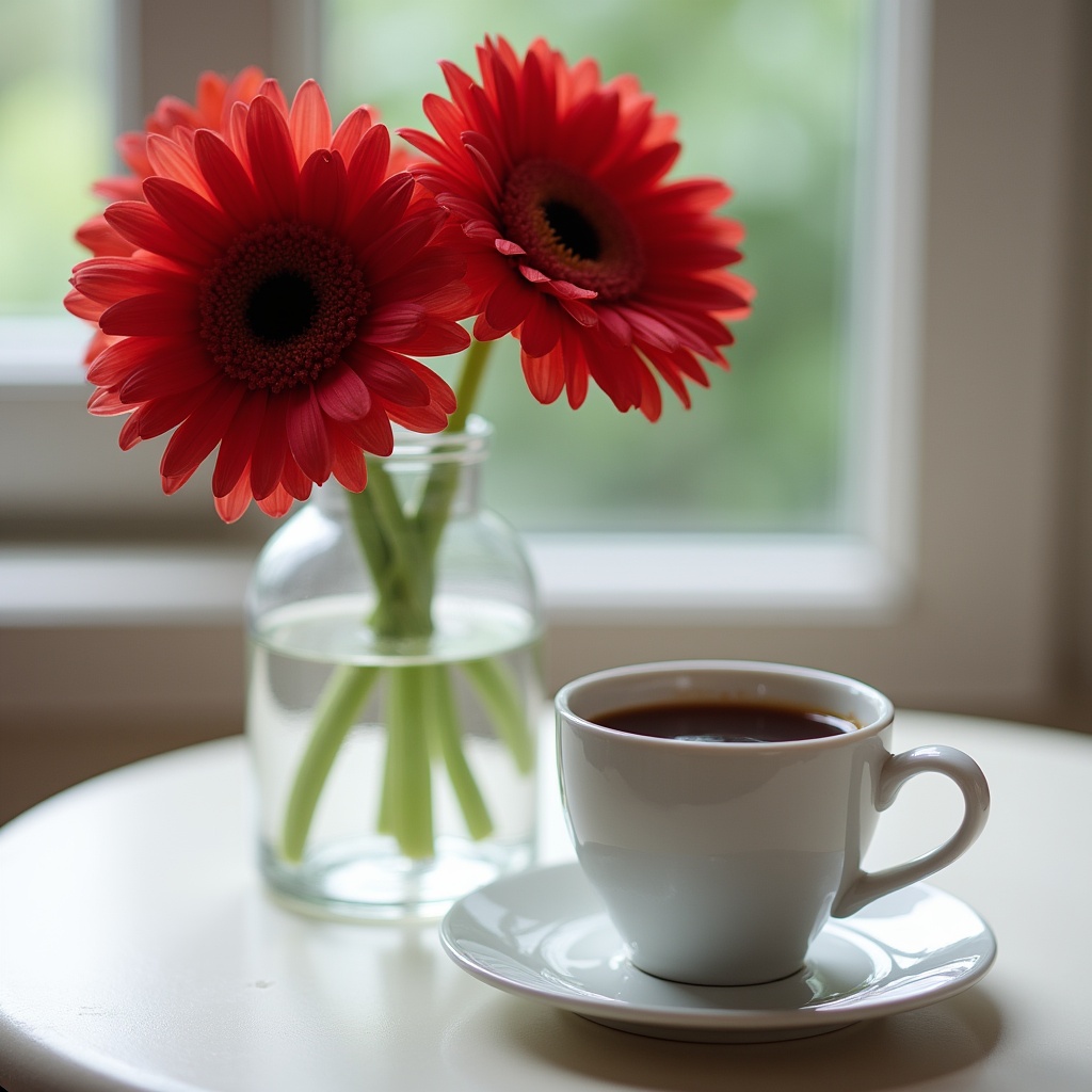 A cup of coffee sits on a white table next to a jar with red flowers. Sunlight comes through a nearby window.