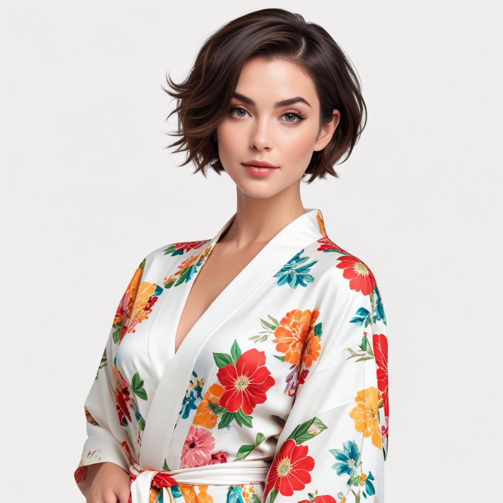 background, beauty, casual, colors, expression, fashion, feminine, floral robe, flowers, garment, hairstyle, indoors, light, model, portrait, pose, relaxed, standing, style, woman