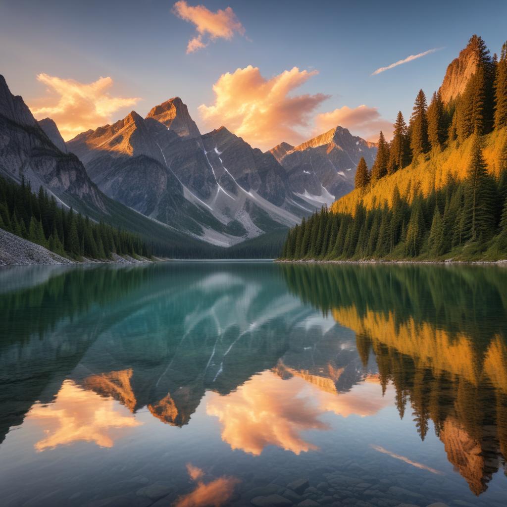 Mountains rise around a clear lake during sunset. Clouds glow orange and pink above, casting reflections in the still water below.