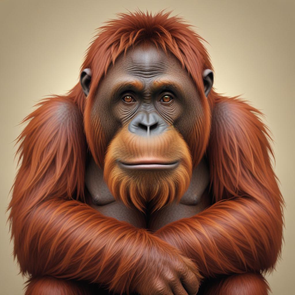 An orangutan sits with its arms crossed. Its fur is a deep orange-brown. The animal looks directly at the viewer with a serious expression.